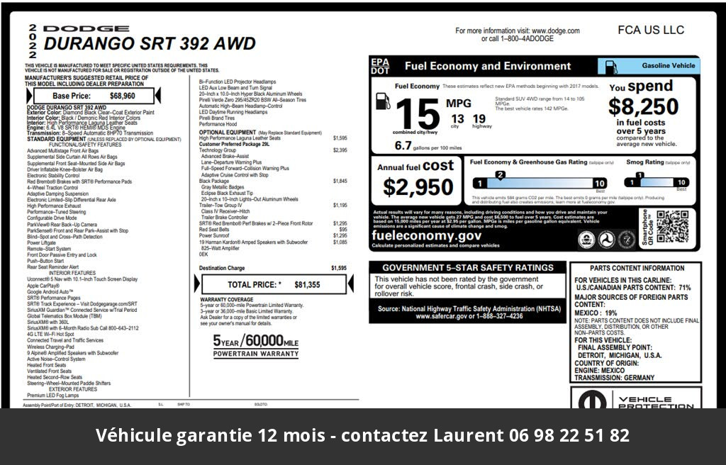 2022 Dodge Durango SRT 392 6.4 V8 hors homologation 4500e